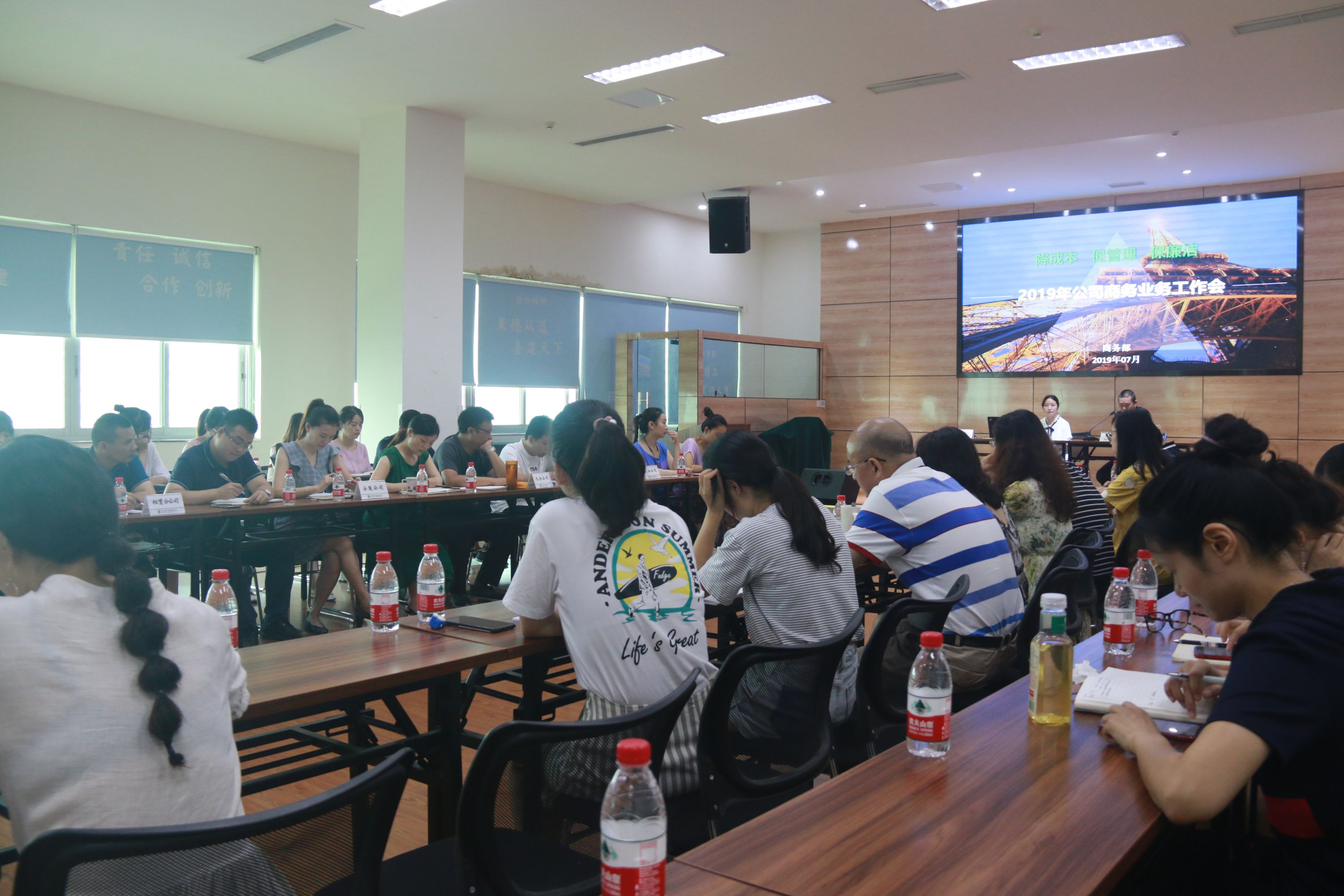 近日,公司商务部开展了以“降成本、促管理、保廉洁”为主题的2019年公司商务业务工作会。公司领导、公司商务部、各单位分管领导、商务部经理及相关业务骨干等共计60余人参加了本次会议,外区单位以视频会议形式参加。会议总结了2019年上半年公司商务部招标管理、要素价格分析、供方管理、合同管理、民工工资支付管理等工作的开展情况,同时安排部署了2019年下半年主要商务工作任务。