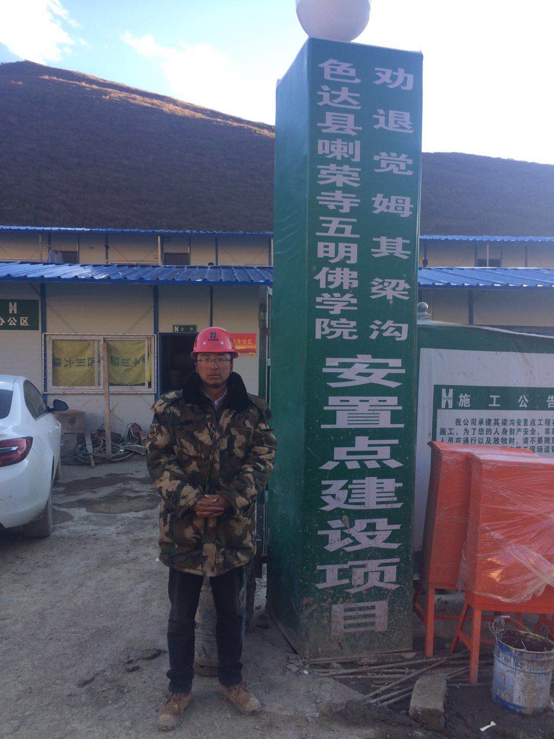 他叫徐攀,担任五明佛学院劝退觉姆安置点其梁沟项目生产经理,“在我工作的5年时间里,这是我第一次切身地感受到在这里工作是什么样的感受!”在现场,带着那顶红色的印有“四川六建”的安全帽,身穿绿色军大衣,脚踏一双不超过50元的军绿劳保鞋的他,如是说道。