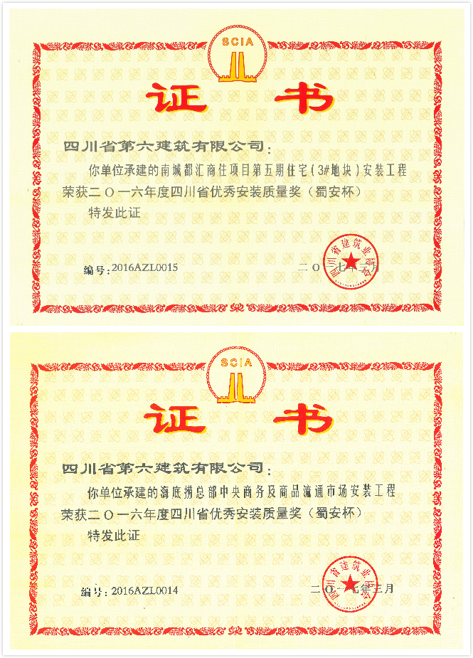 近日,由公司承建的南城都汇商住项目第五期住宅(地块3#)安装工程及海底捞总部中央商务及商品流通市场项目安装工程,经主管部门初评、复查、评审、公示后,分别荣获2016年度四川省优秀安装质量奖。