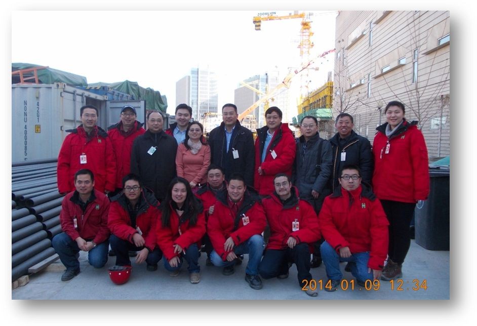 陈贵林一行在短暂考察了项目施工现场后,听取了项目部主要管理人员对于北京项目管理工作汇报。北京项目采用的管理系统是综合西方先进的项目管理经验,通过广州美领馆实践总结,结合北京项目实际而建立的高效精准的管理体系。项目部在新技术、新材料和新管理方法等领域不断探索创新,文档管理实现了对项目信息的全方位覆盖,各项单项工作开展前对施工前会议的成熟运用,大量使用样板和模型确定工艺标准。同时,采用了P6进度计划软件进行项目总控及BIM建筑信息系统进行综合管线设计和施工管理。项目部目前大模板技术、冬季施工成套技术、大型设备吊装技术等都处于北京地区领先水平。