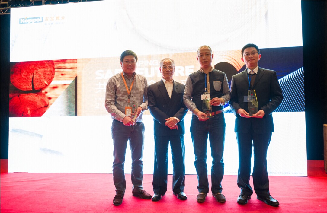 2014年3月14日,八分公司主任工程师张翔(图右一)在上海领取吉宝置业工业安全等级评估金奖(吉宝·凌云峰阁项目荣获)。