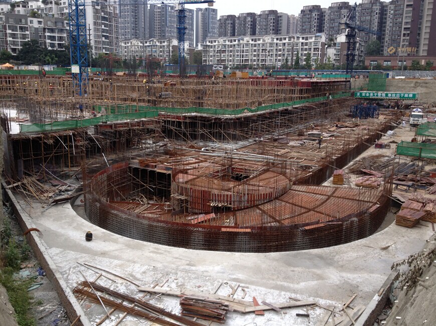 项目简介:“郫县重百汉正广场”是郫县政府的重点建设项目,大型城市综合体工程。位于郫县郫筒镇,紧邻郫县政务中心,项目主立面临郫县主干道-东西大街,工地左侧有高压电网及高压电站,施工场地非常狭窄。本工程共有2栋独立塔楼、3个商业裙楼及一个地下车库。总占地面积19637.92㎡,建筑面积111546.97m²,建筑总高度达99.40m。地下室筏板基础最厚达到1900mm,底板设有抗浮锚杆。